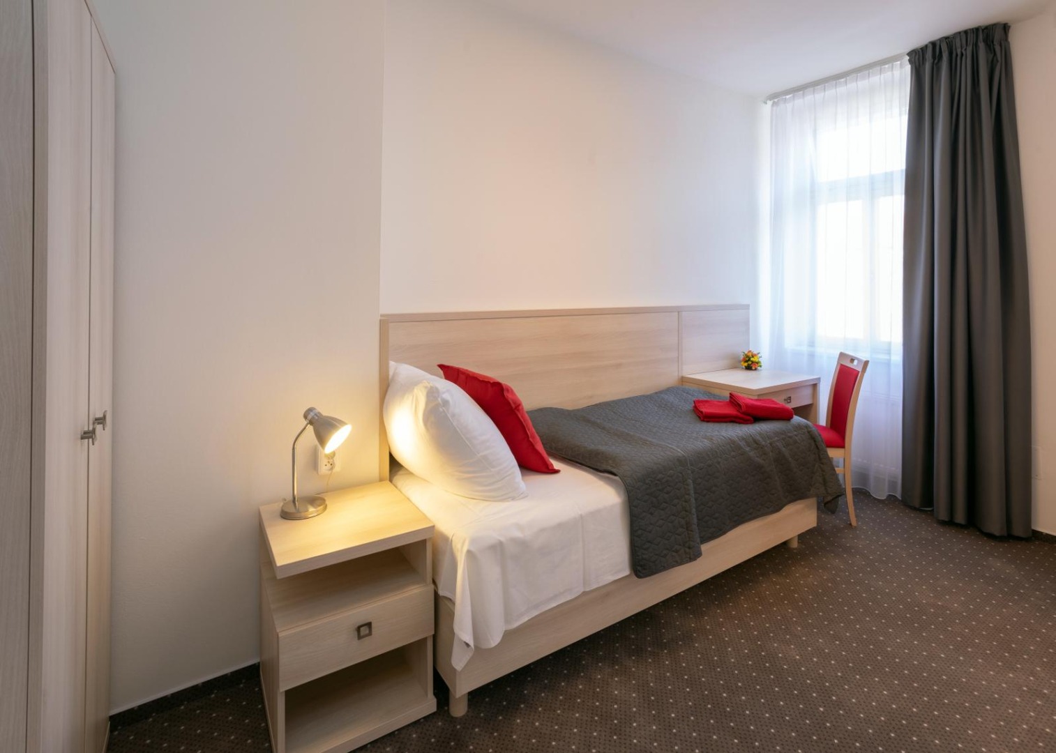 Hotel se nachází v zadním traktu budovy studentské koleje. Nabízí svým hostům komfortní cenově dostupné ubytování. Cestou k svému hotelovému pokoji projdete chodbami, ve kterých se nachází pokoje studentů. Snídaně Vám bude servírovaná formou nabídky z bufetových stolů. Parkování je možné za poplatek v uzavřeném areálu Masarykovy koleje.